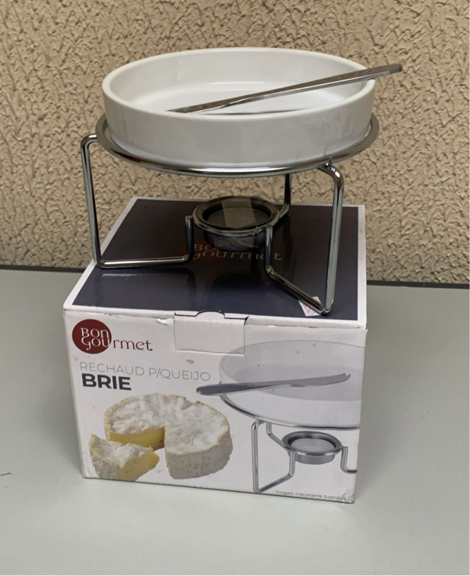 Kit rechaud 15 cm para queijo Brie de cerâmica com faca de aço inox e suporte Bon Goumert- 26373 Este Rechaud para queijo Brie traz elegância e praticidade para esta nova sensação do momento. Composto por um refratário de cerâmica, uma faca e um suporte com queimador e compartimento para vela, reúne tudo o que você precisa para servir e degustar. Para quem ainda não provou um queijo Brie quente com uma geléia ou mel, fica a nossa dica ! Informações do Produto Marca Bon Goumert Modelo Brie Material Suporte Aço Inox Faca Aço Inox Refratário Cerâmica Medidas Suporte 16 cm de diâmetro X 11 cm de altura Faca 16 cm de comprimento Refratário 15 cm de diâmetro X 2,5 cm de altura Cor Branco e Prata Conteúdo 1 Suporte, 1 Faca e 1 Refratário